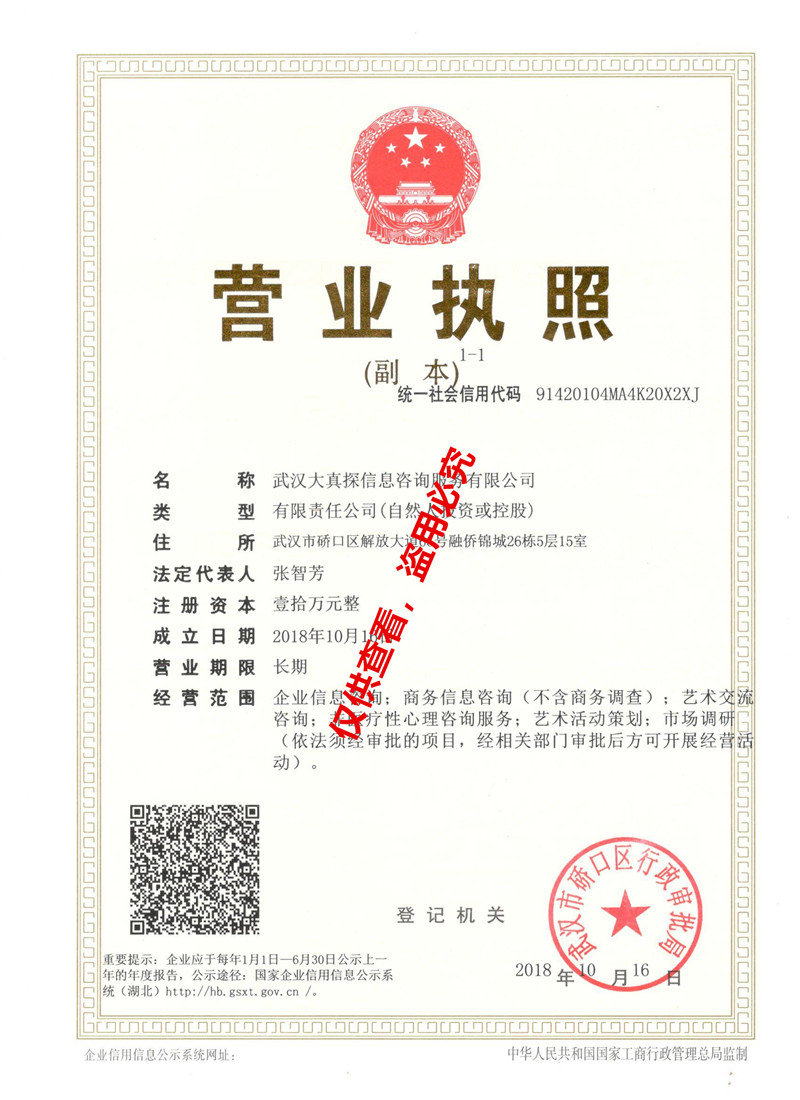 武漢大真探信息咨詢服務(wù)有限公司,是一家經(jīng)國家工商注冊成立的正規(guī)合法公司,主要為各類客戶提供婚姻咨詢、背景咨詢、情感咨詢、市場調(diào)研咨詢等商業(yè)信息咨詢服務(wù)。實(shí)力雄厚、設(shè)備先進(jìn),自成立以來始終以服務(wù)客戶的合法權(quán)益為宗旨,本著認(rèn)真負(fù)責(zé)、合理合法、實(shí)事求是、誠信保密、專業(yè)規(guī)范的工作理念,為各類客戶提供一流的調(diào)查工作和服務(wù),成立至今已出色的完成了眾多客戶的委托,取得了驕人的業(yè)績,得到了廣大客戶的認(rèn)可,在同行中有較高的聲譽(yù)。秉承“誠信第一,客戶至上”的理念,竭誠為各大企業(yè)、個(gè)人提供滿意服務(wù)。